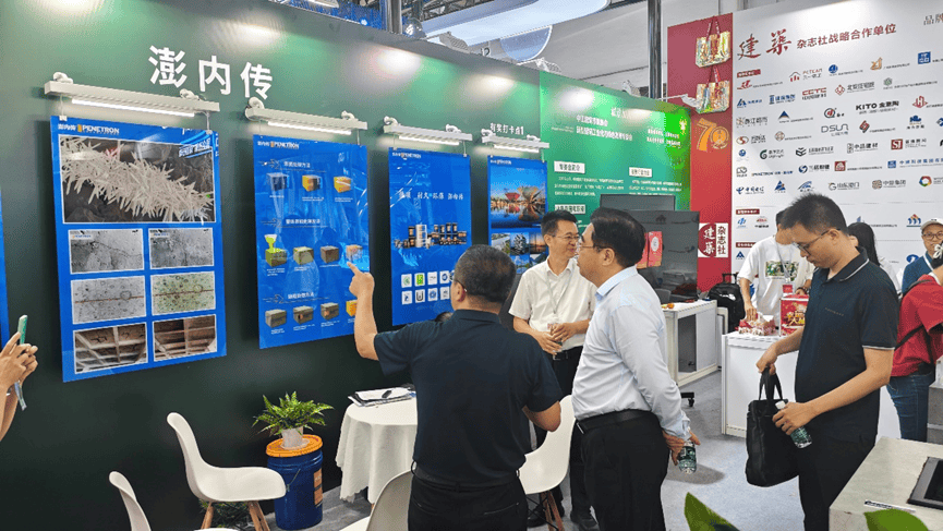 北京澎內(nèi)傳公司展出了全球領先的混凝土滲透結晶自愈合技術以及系統(tǒng)產(chǎn)品,展板上生動形象的展現(xiàn)出滲透結晶的技術原理、電鏡下的結晶形貌和實效工程照片等;實物水池模型與試塊直觀地看到結晶自愈合后的功效。澎內(nèi)傳先進的滲透結晶科技不僅能從根本上解決混凝土結構的滲漏水頑疾,還能提高混凝土整體的耐久性,延長結構的使用壽命60年。產(chǎn)品低碳環(huán)保,為我國造就高質量建筑和可持續(xù)發(fā)展的目標提供堅實的技術基礎和科學的安全保障,更好的滿足人們對好房子的需求。